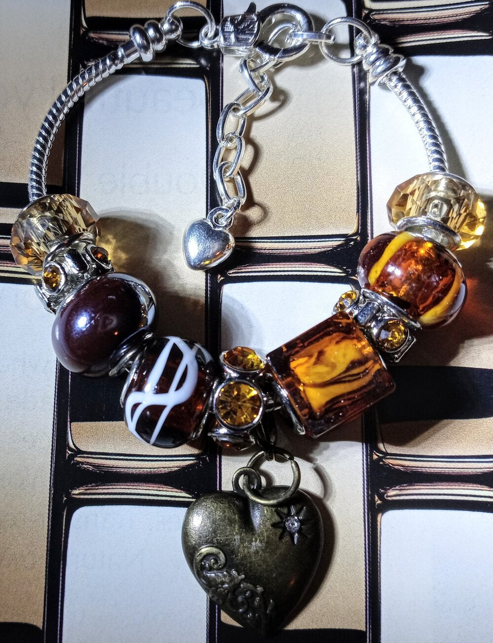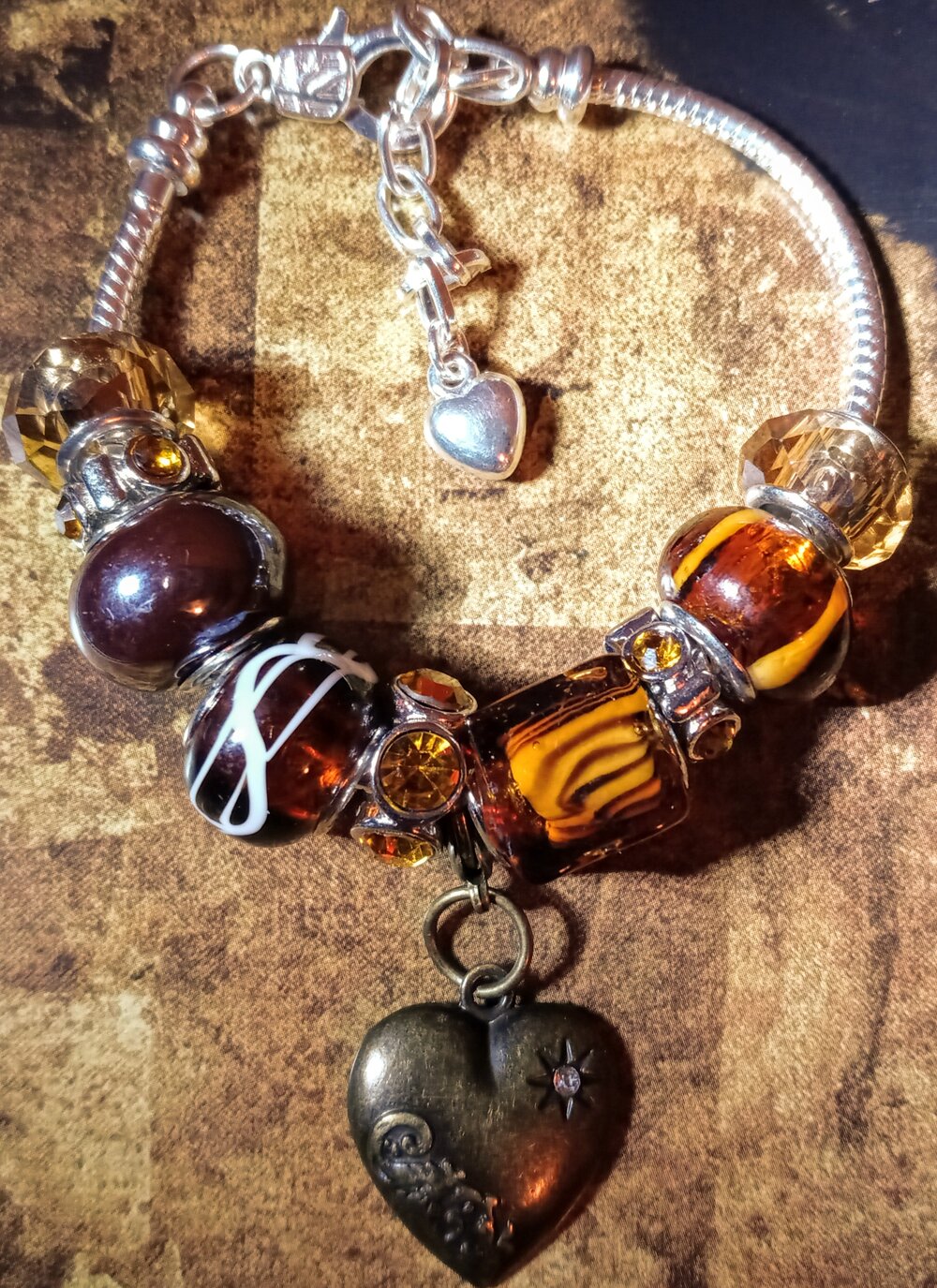 Who has a sweet tooth? The deep Mahogany and Amber hues of this piece are the perfect accent to every skin tone. The aged Bronze heart pendant is sure to fuel chocolate filled nights of love. This piece is set on a 7.5” Silver Plated Snake chain to offer durability and a stylish finish...COME GET THE LOOK!!!
