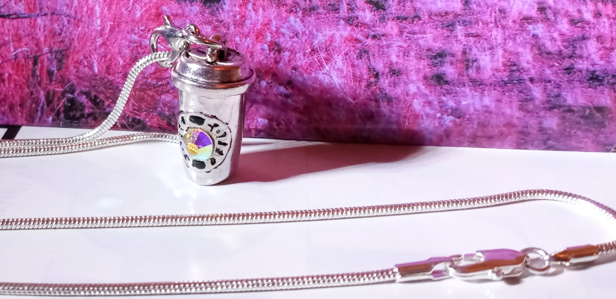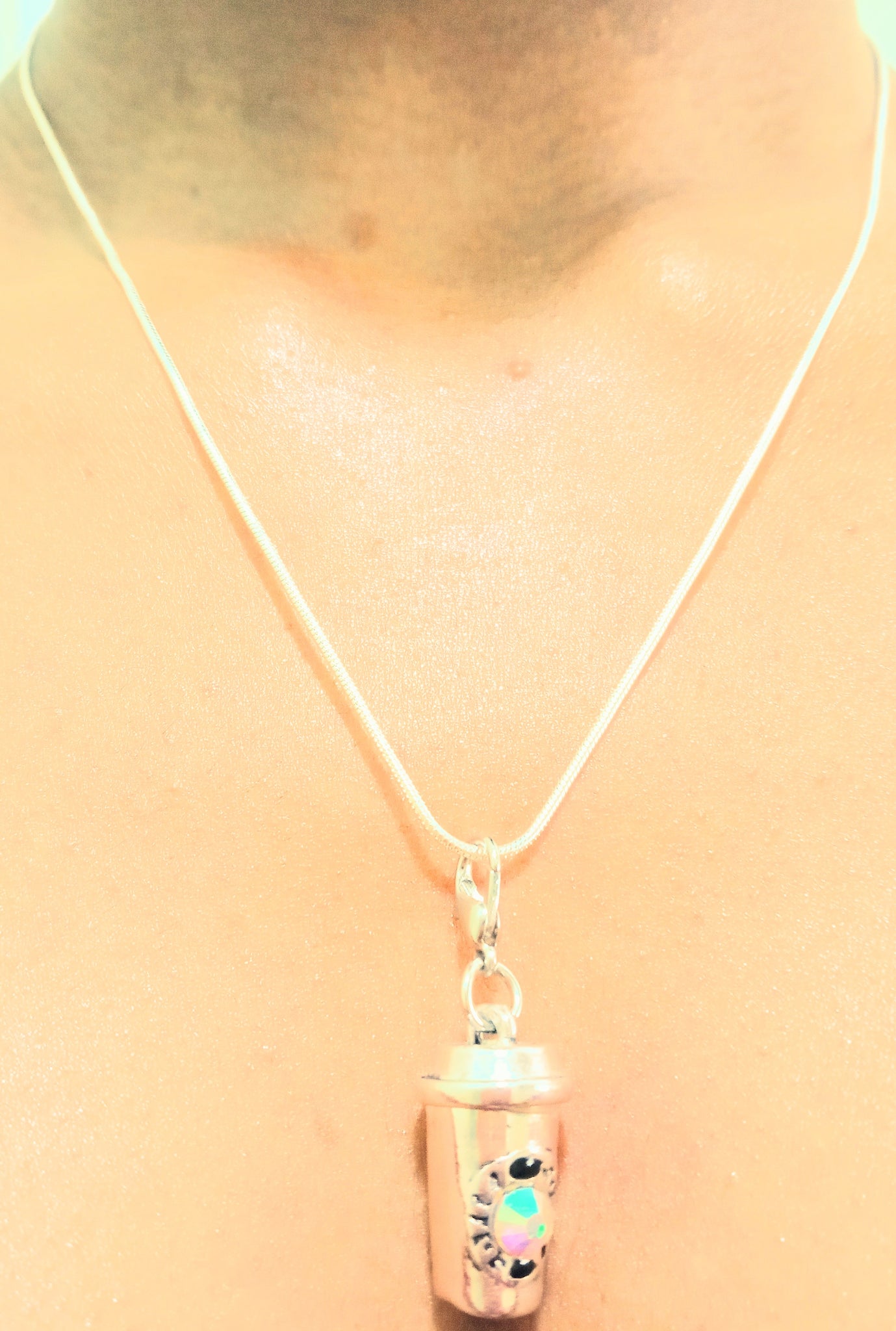 Can’t start your day without it? If part of your morning routine includes a stop for some joe then this necklace is for you. Not just your average cup of coffee, this blinged out show stopper is displayed on an 18 inch silver snake chain necklace and is the perfect accent for your morning commute.(Heavy Charm)