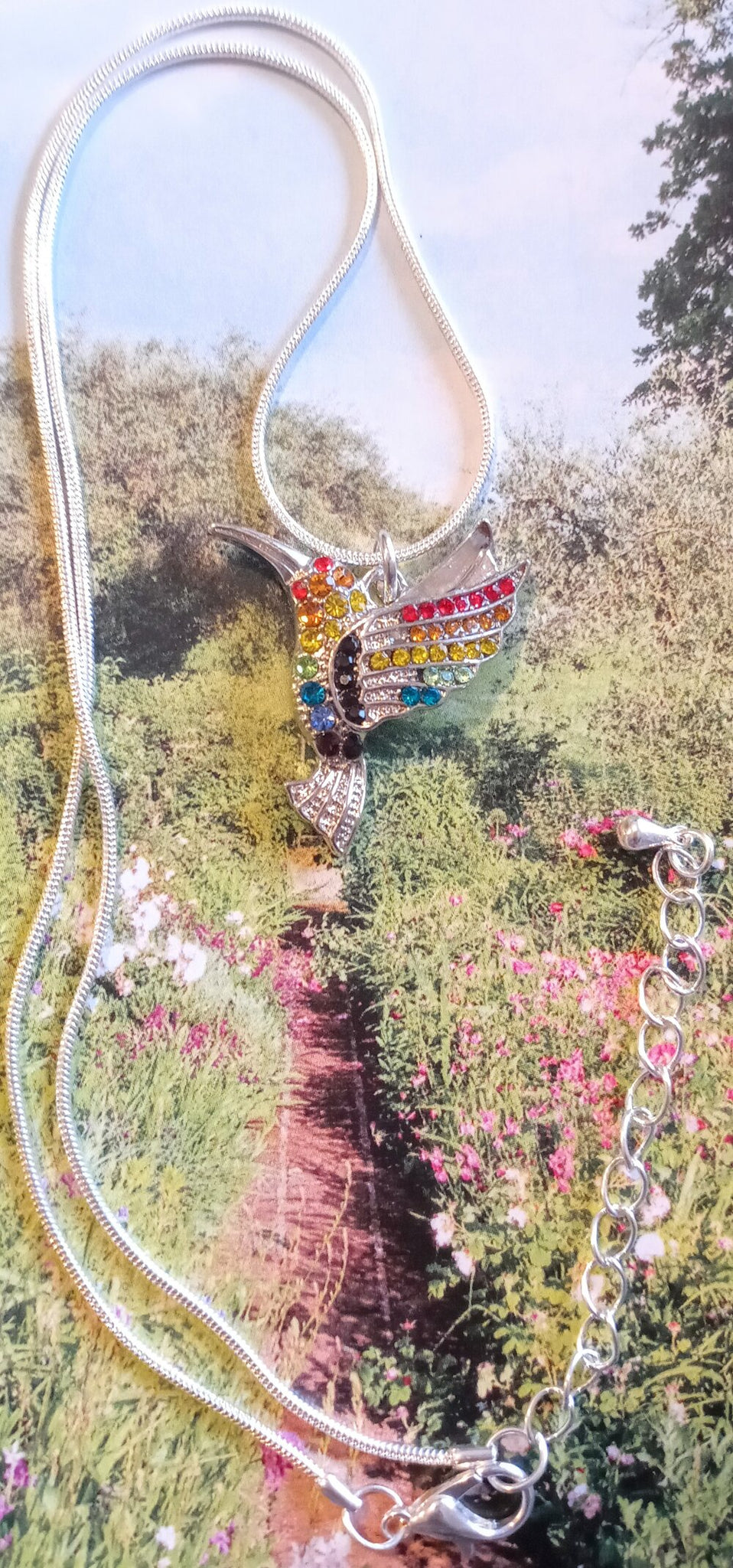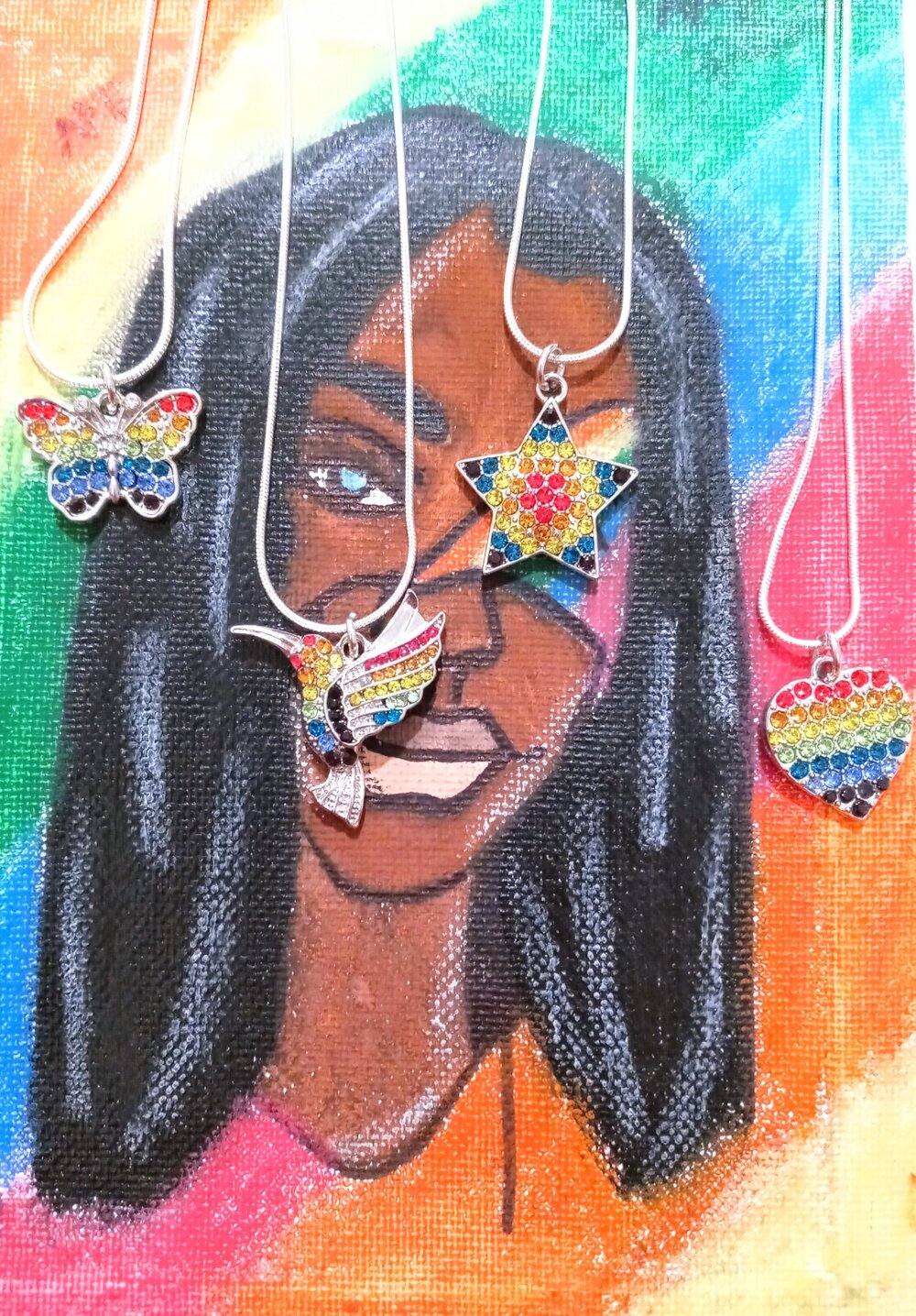 Take pride in yourself, your individuality, your special inner and outer being. Be proud of who you are and express it with these beautifully hand crafted pendants. Seated on a 16 inch silver snake chain each pendant is filled with sparkling gems arranged in a rainbow pattern. LAYER YOUR LOOK GET ALL 4 GOING FAST FOR PRIDE...COME GET THE LOOK