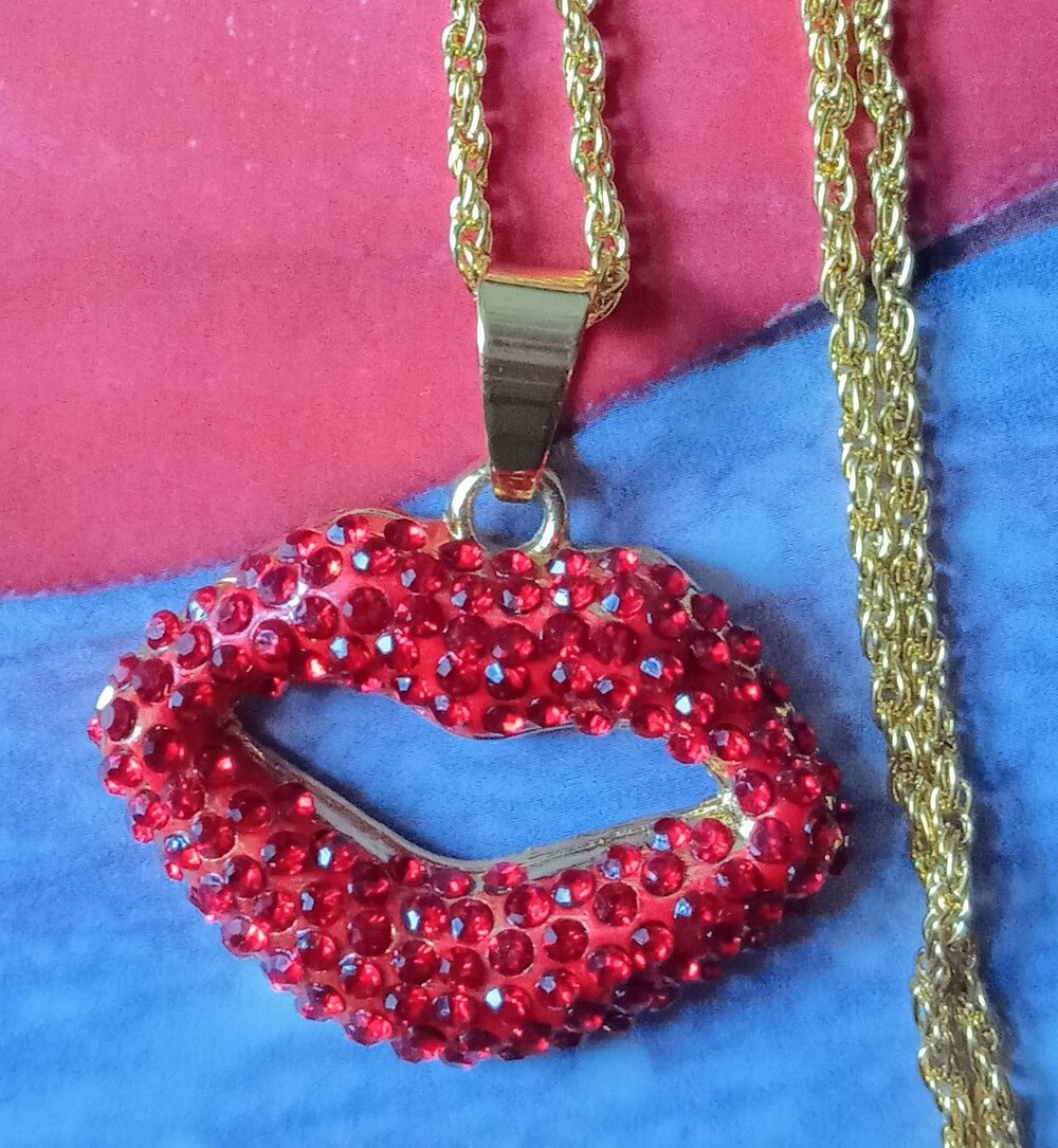 Pucker up and hang a big one around your neck. This is one set of lips that no one will forget. Heavy gem laden charm. Hung on a (22”ADJUSTABLE)strong Gold chain to accent your style, this is one accessory every Boujee’ Girl should have.