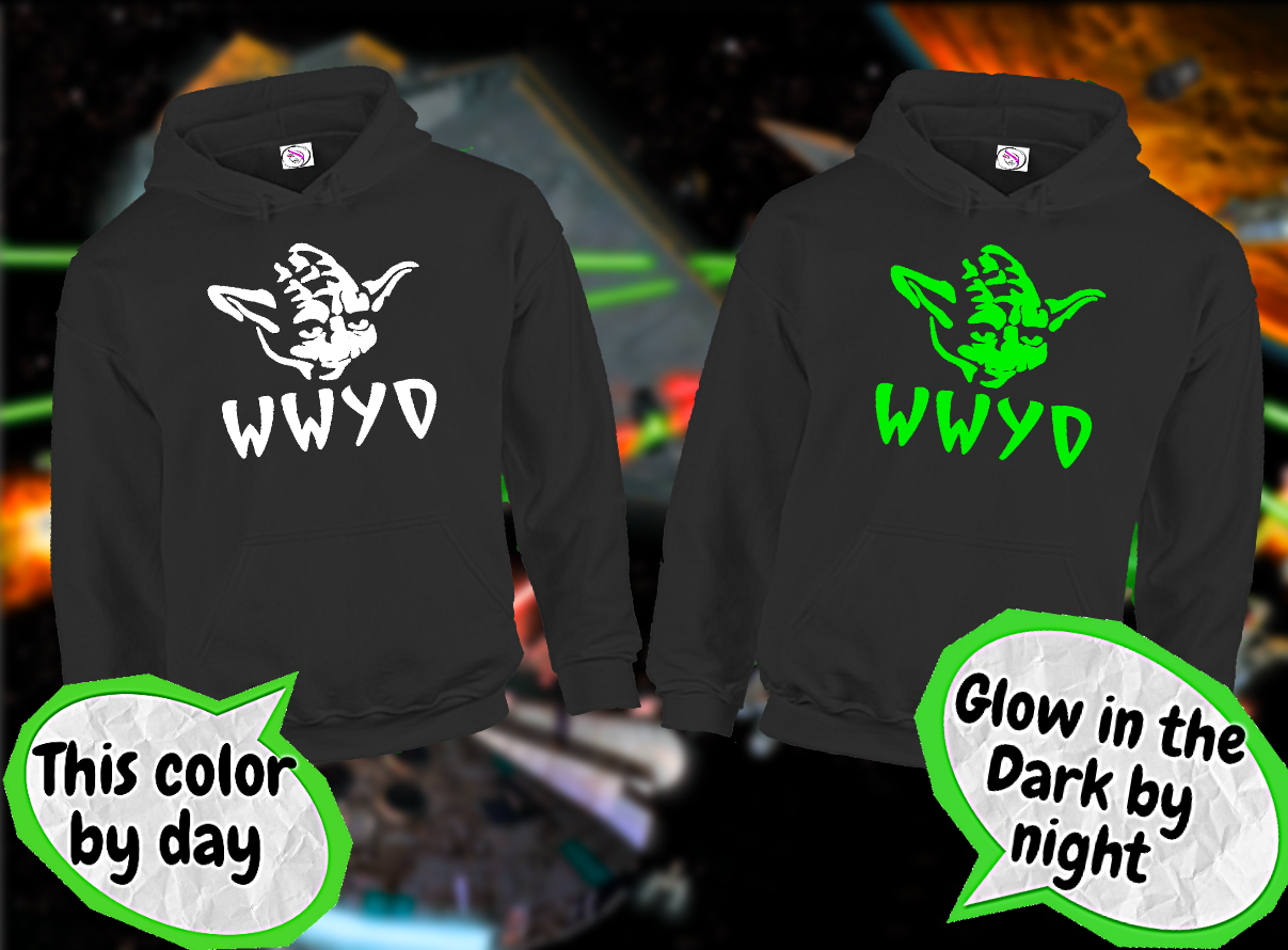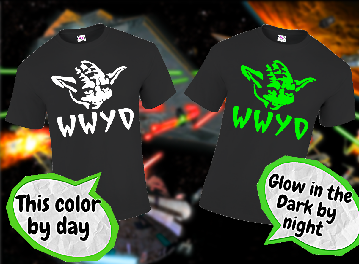 Dude...IT ReaLLy GLoWs...The Force is strong with this Shirt....Perfect gift for the Nerd girl/boy in your life....What Would Yoda Do.....Be the Jedi Master of your circle in the day and at Night as you light up the room....